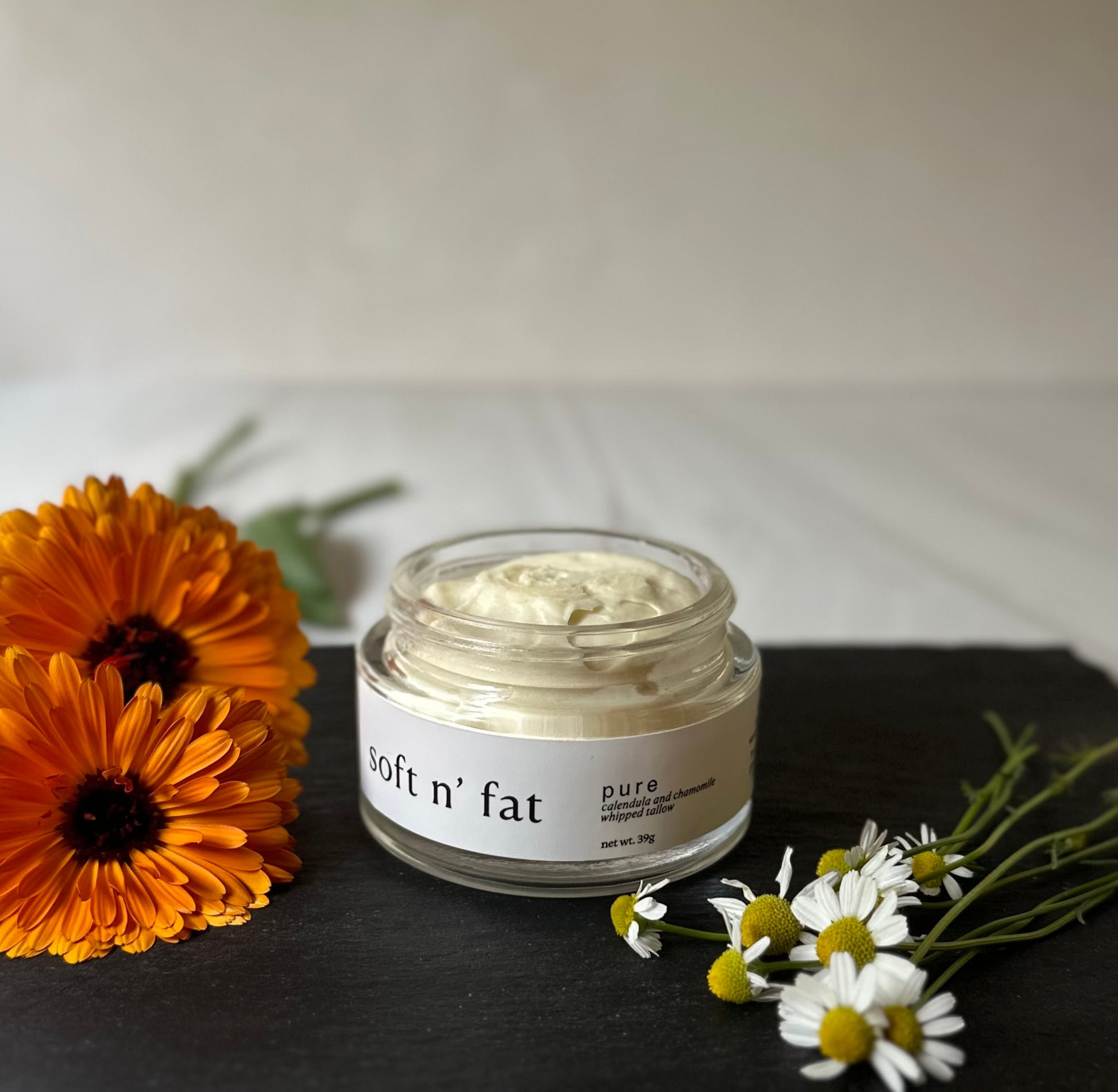 grassfed&finished tallow, calendula officinallis, matricaria chamomilla